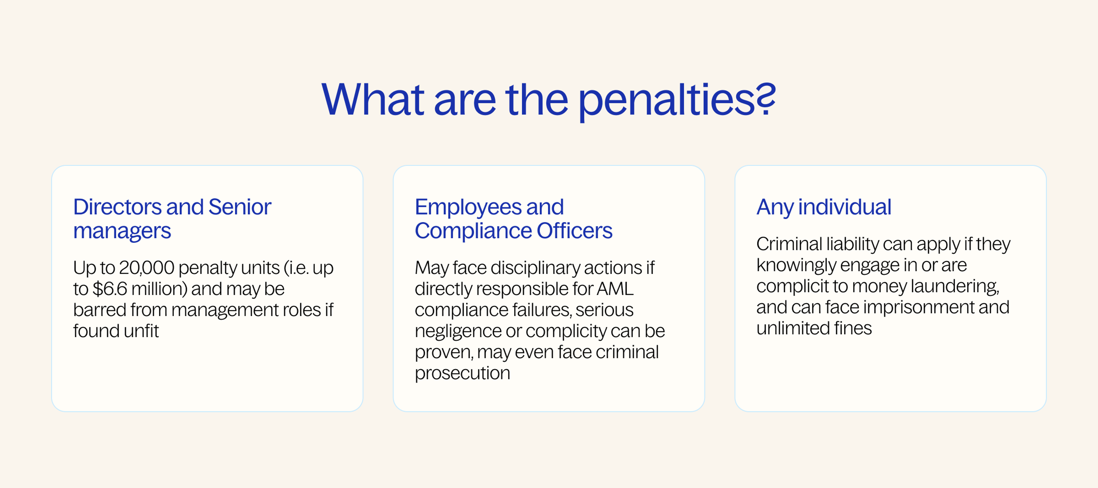 In Australia, individuals who fail to meet AML regulations can face fines, bans and even criminal charges depending on their role and the severity of the breach.