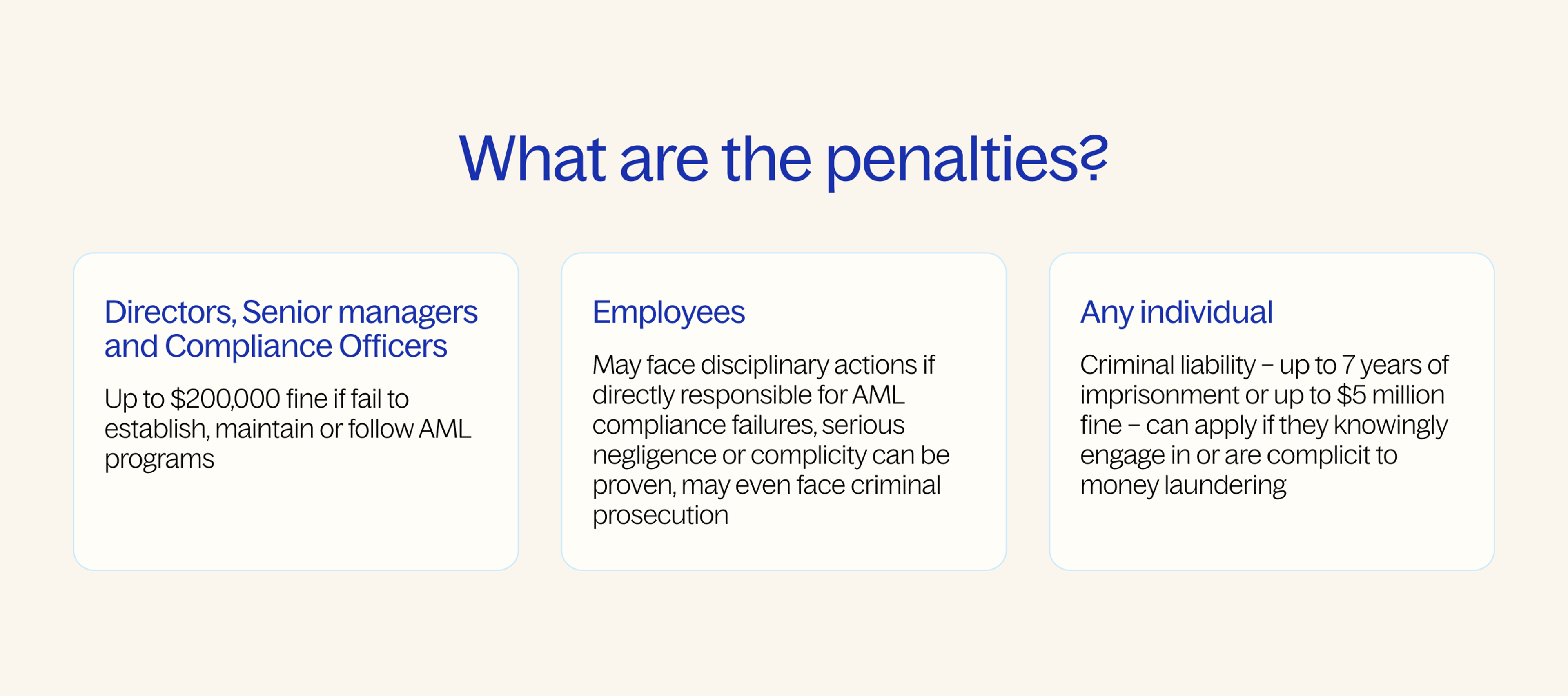 • Criminal liability can apply to any individual involved if they knowingly engage in or are complicit to money laundering, and can face up to 7 years imprisonment or fines of up to $300,000. Reporting entities can face penalties of up to $5 million.